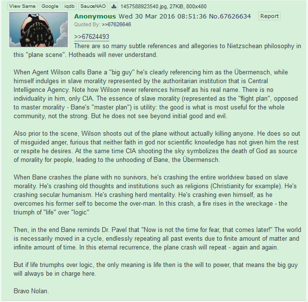Nietzschean Baneposting explores the Plane Scene through the lens of the philosophy of late 19th century German thinker Friedrich Nietzsche, developed further by modern genius Bravo Nolan.